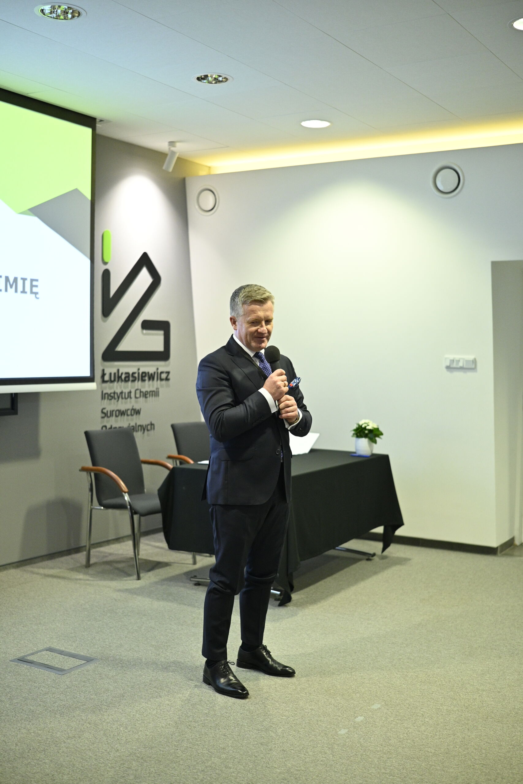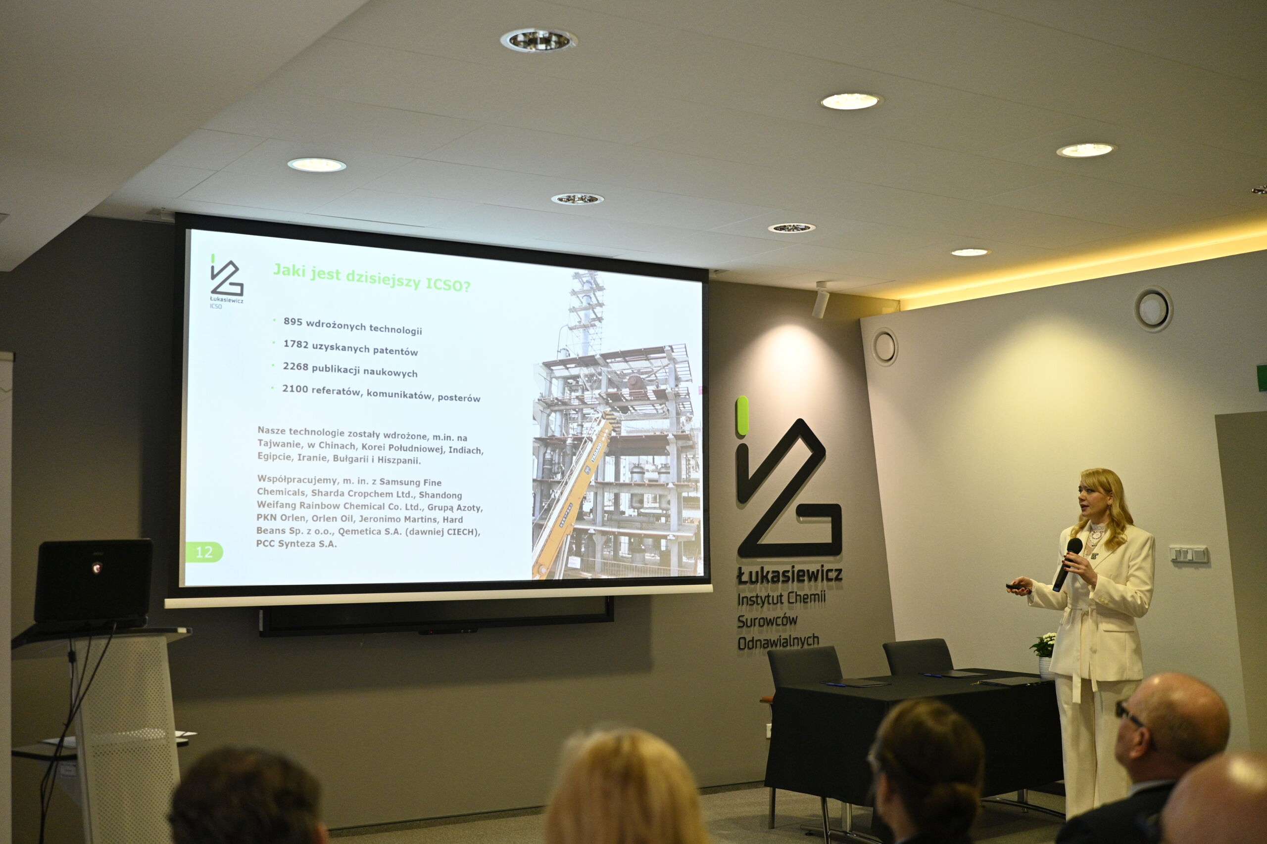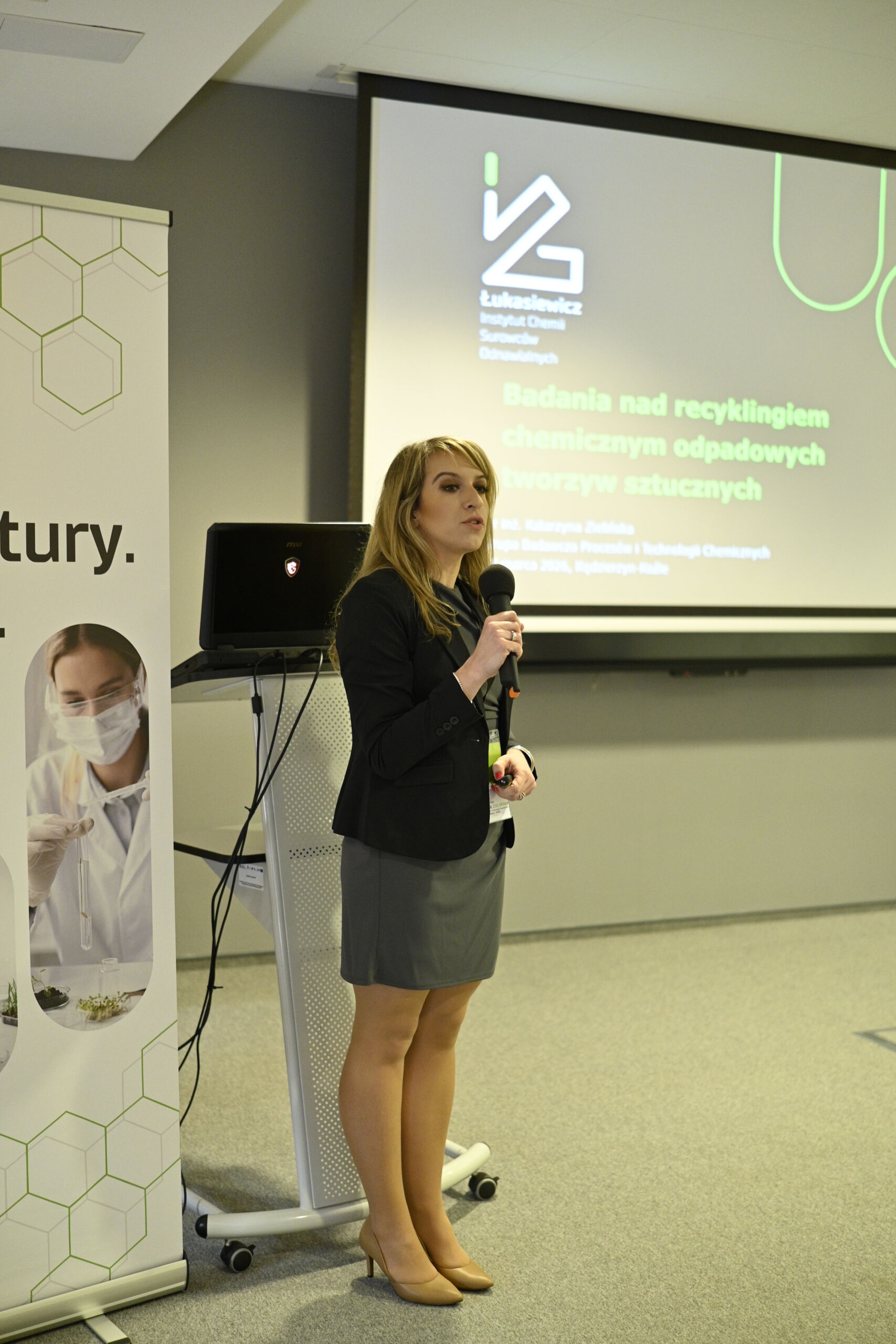 Zgromadzeni goście mieli okazję także poznać najnowsze technologie, nad którymi pracują nasi badacze. Dr inż. Katarzyna Zielińska, kierownik Grupy Badawczej Procesów i Technologii Chemicznych, przedstawiła prezentację pt. „Badania nad recyklingiem chemicznym odpadowych tworzyw sztucznych”, a dr Damian Kiełkiewicz, Kierownik Grupy Badawczej Zaawansowane Materiały i GOZ mówił o “Witrymerach epoksydowych – materiałach kompozytowych przyszłości”.