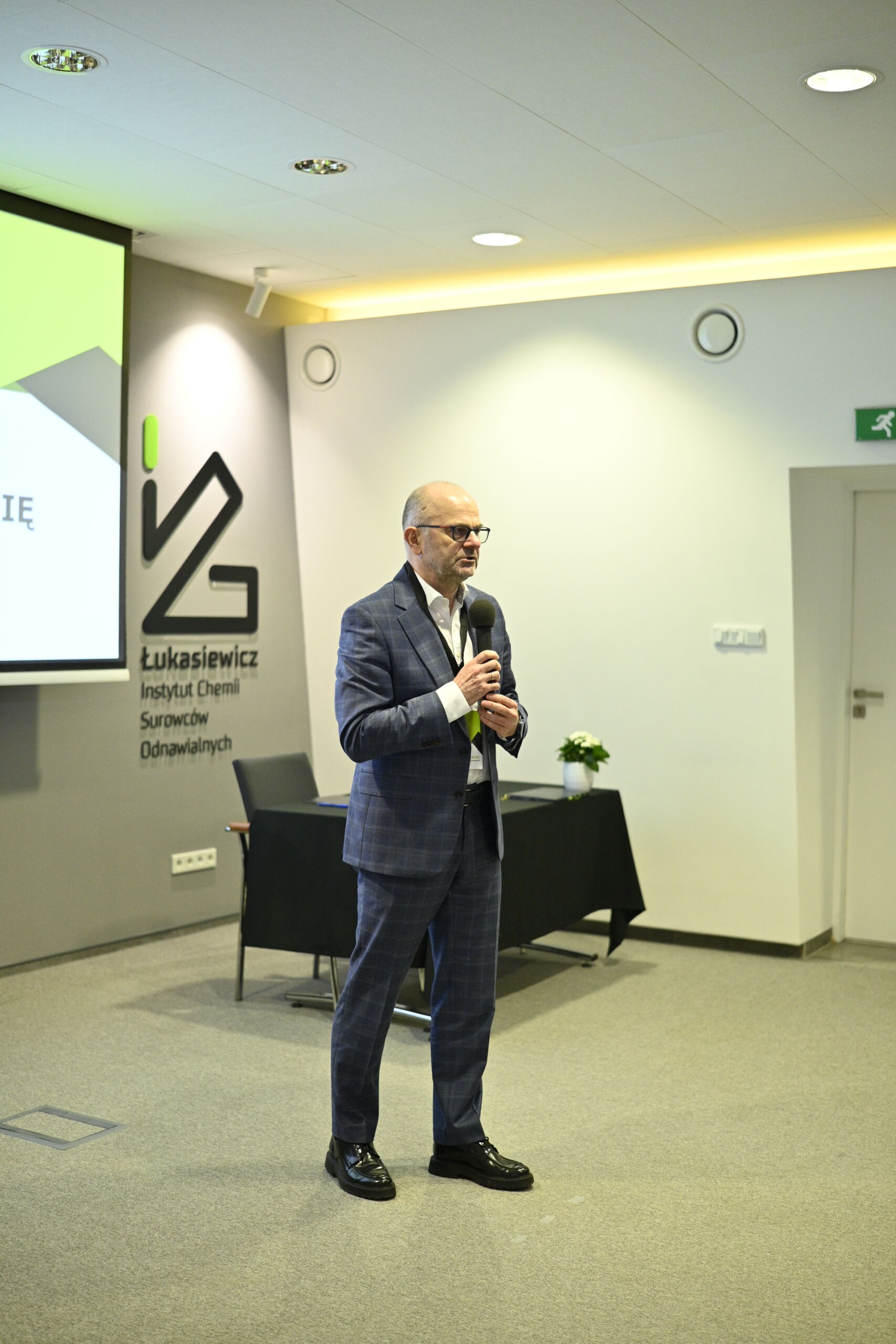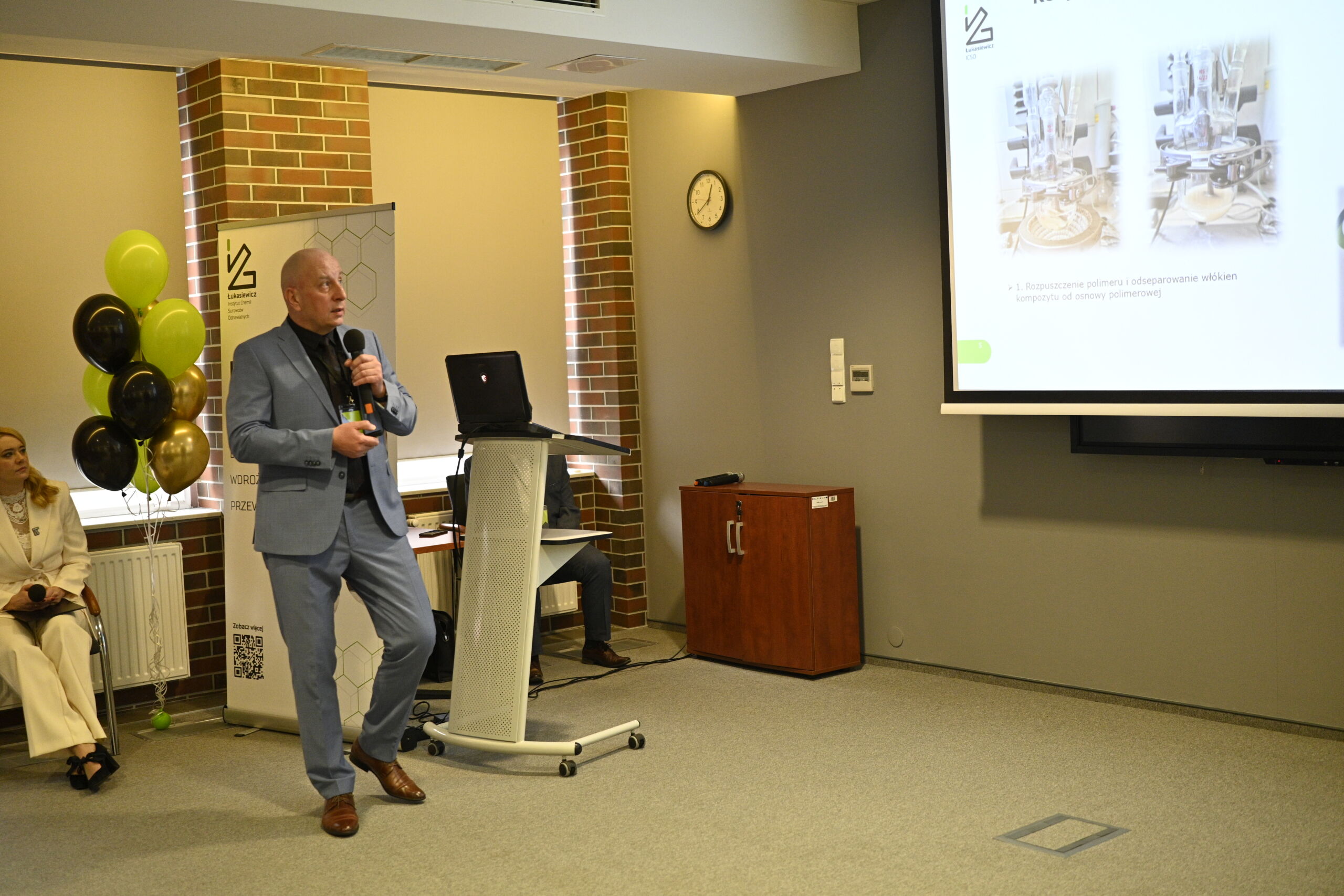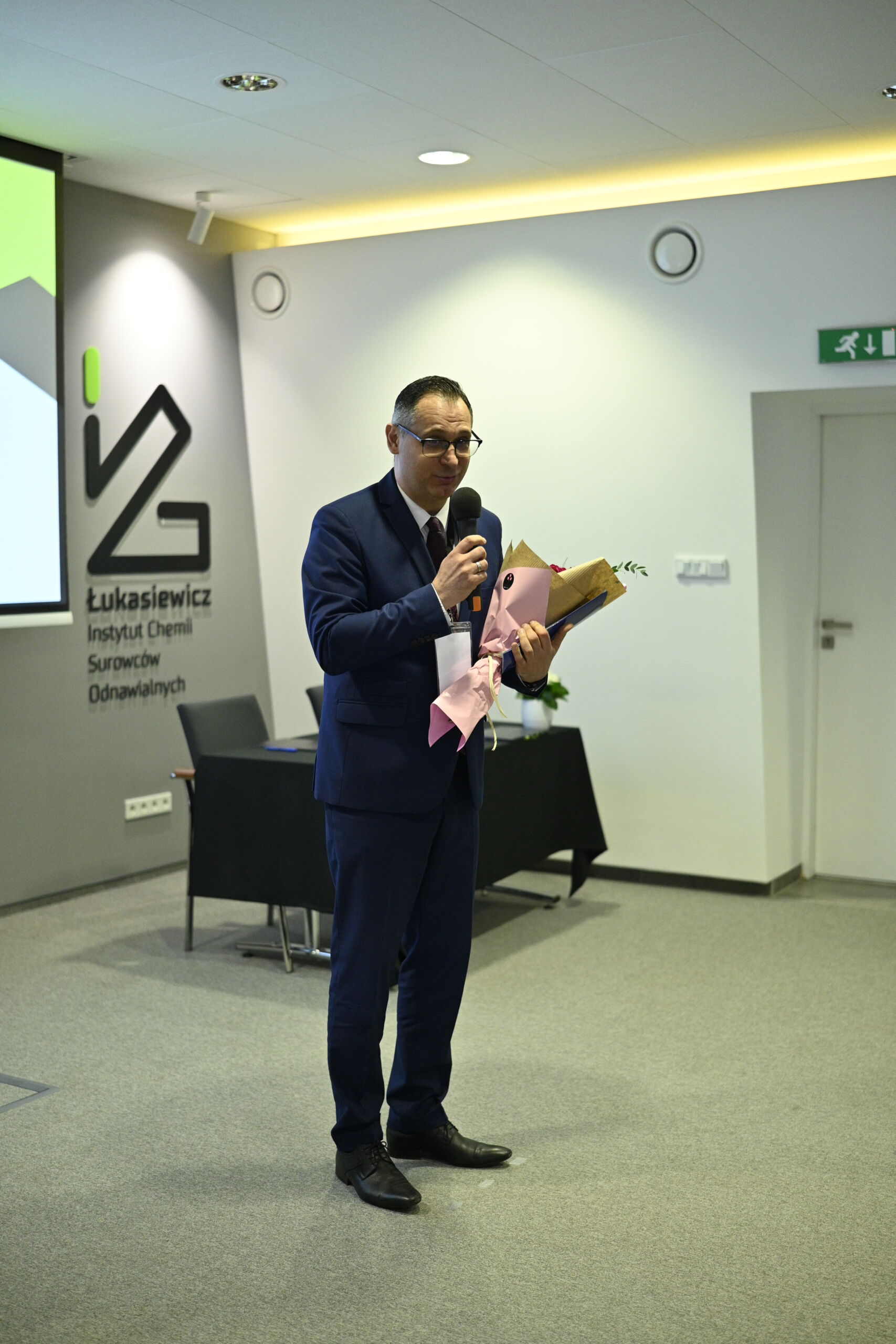 Zgromadzeni goście mieli okazję także poznać najnowsze technologie, nad którymi pracują nasi badacze. Dr inż. Katarzyna Zielińska, kierownik Grupy Badawczej Procesów i Technologii Chemicznych, przedstawiła prezentację pt. „Badania nad recyklingiem chemicznym odpadowych tworzyw sztucznych”, a dr Damian Kiełkiewicz, Kierownik Grupy Badawczej Zaawansowane Materiały i GOZ mówił o “Witrymerach epoksydowych – materiałach kompozytowych przyszłości”.